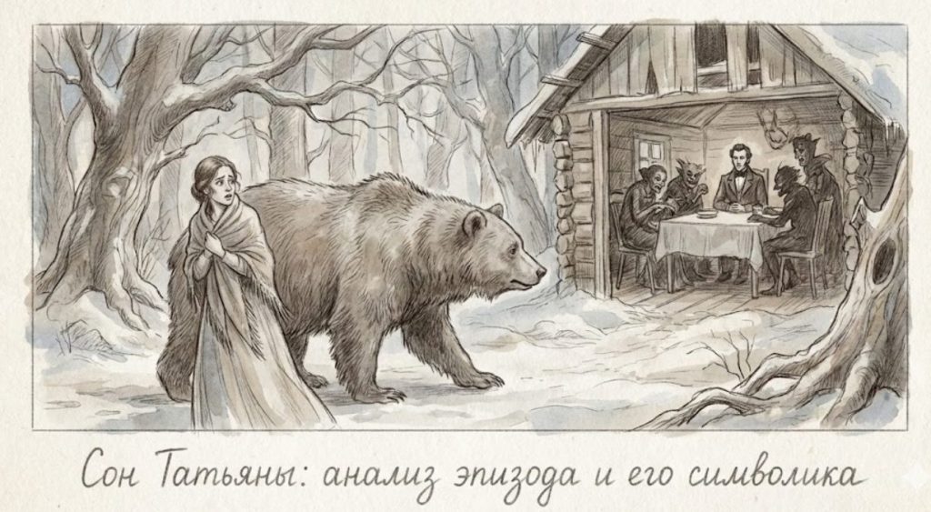 Сон Татьяны (5-я глава) — это кульминационный эпизод, связывающий фольклорные мотивы и психологический анализ. Он является композиционным центром романа, предсказывающим ключевые события сюжета: дуэль Онегина и Ленского, а также замужество героини. Через символику сна Пушкин раскрывает «русскую душу» Татьяны, ее подсознательные страхи и интуитивное понимание демонической природы Онегина.